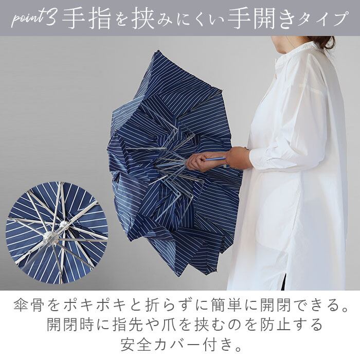 ・傘骨をポキポキと折らずに簡単開閉できる手開きタイプ。開閉時に指先や爪を挟むのを防止する安全カバー付き。