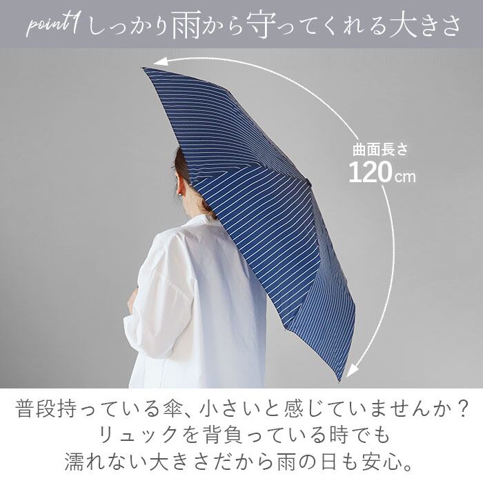 ・傘生地を開いた時の直径は約110cmと、長傘と比べても遜色のない大きさ。