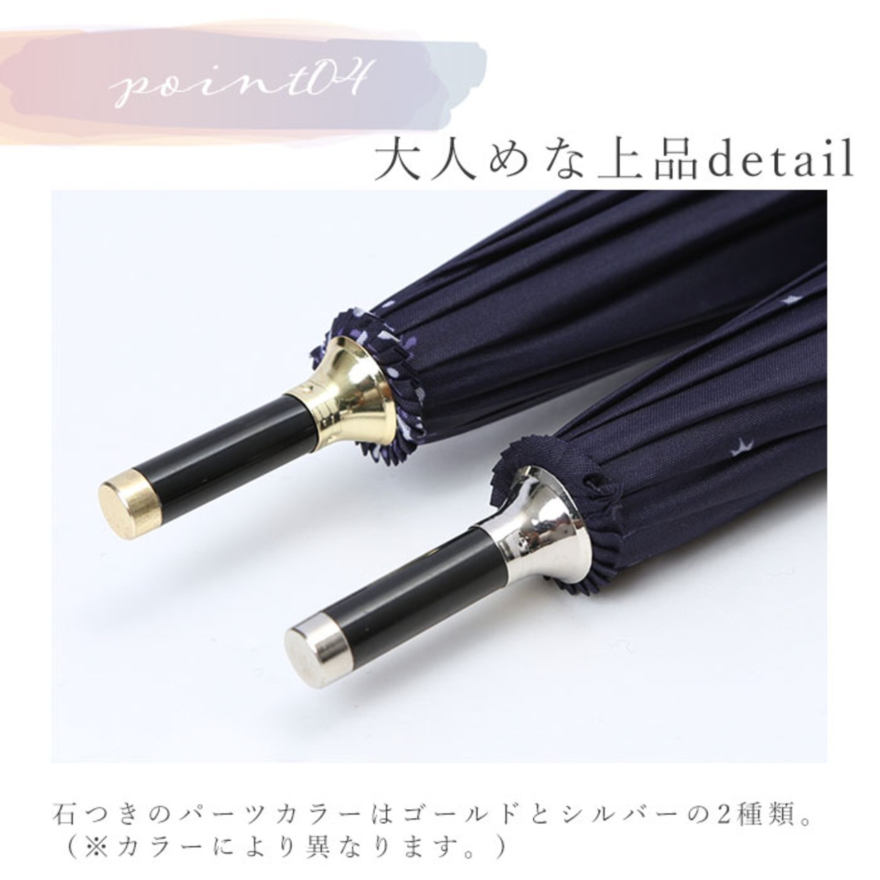 ・傘生地をまとめるバンドはワンタッチで留めやすいホックボタン式。ボタンとつゆ先、石つきのパーツカラーはゴールドとシルバーの2種類。(※カラーにより異なります。)