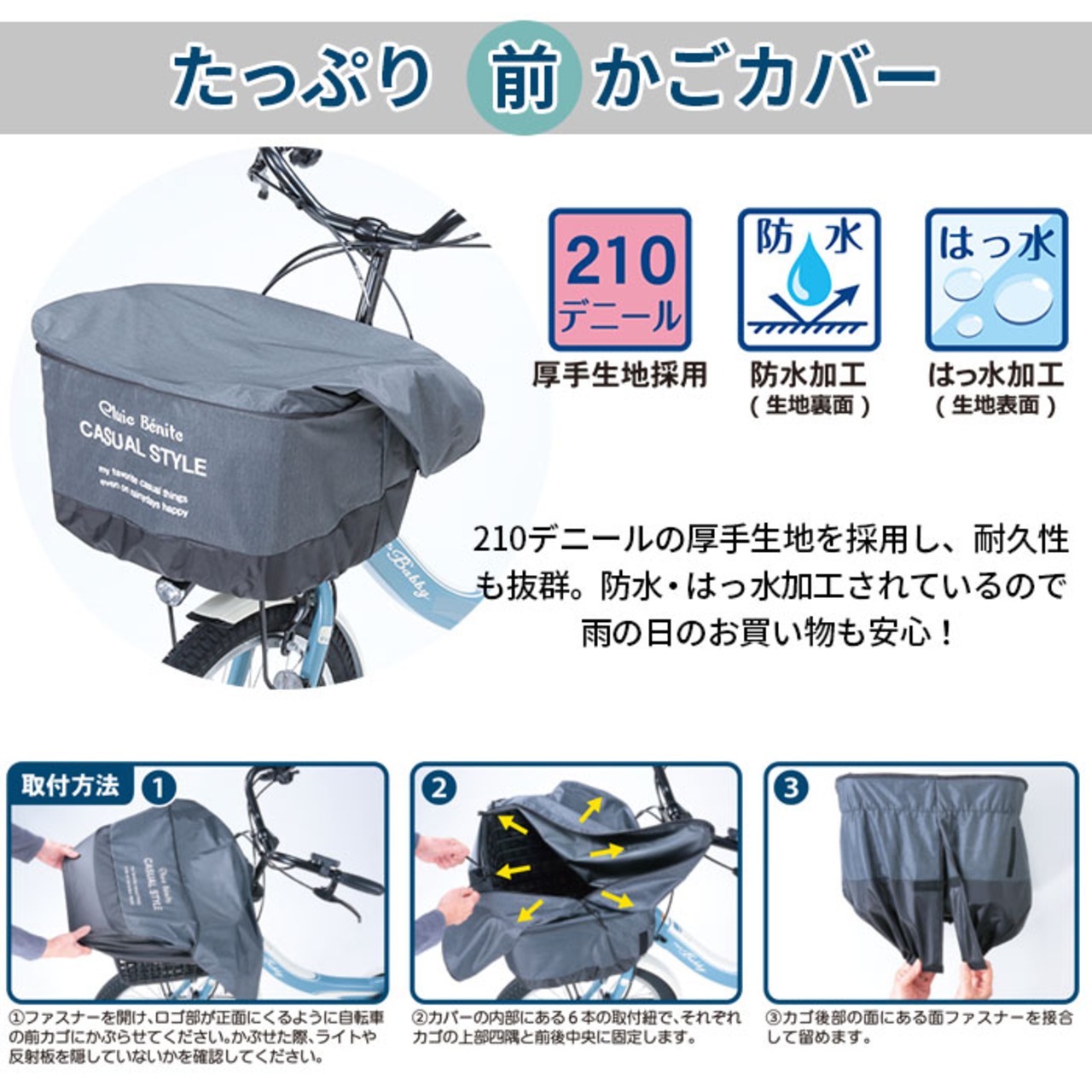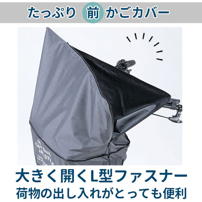 ・大きな角型・ワイド型の前カゴに対応。素材には210デニールの厚手生地を採用し、耐久性も抜群。