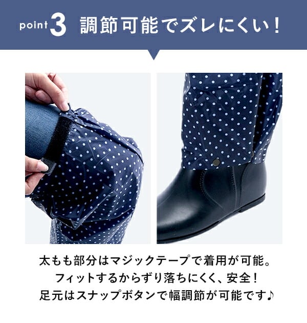 足元はスナップボタンで幅の調節ができ、太もも部分はマジックテープで調節ができるので、カバーがずれるのを防止します。