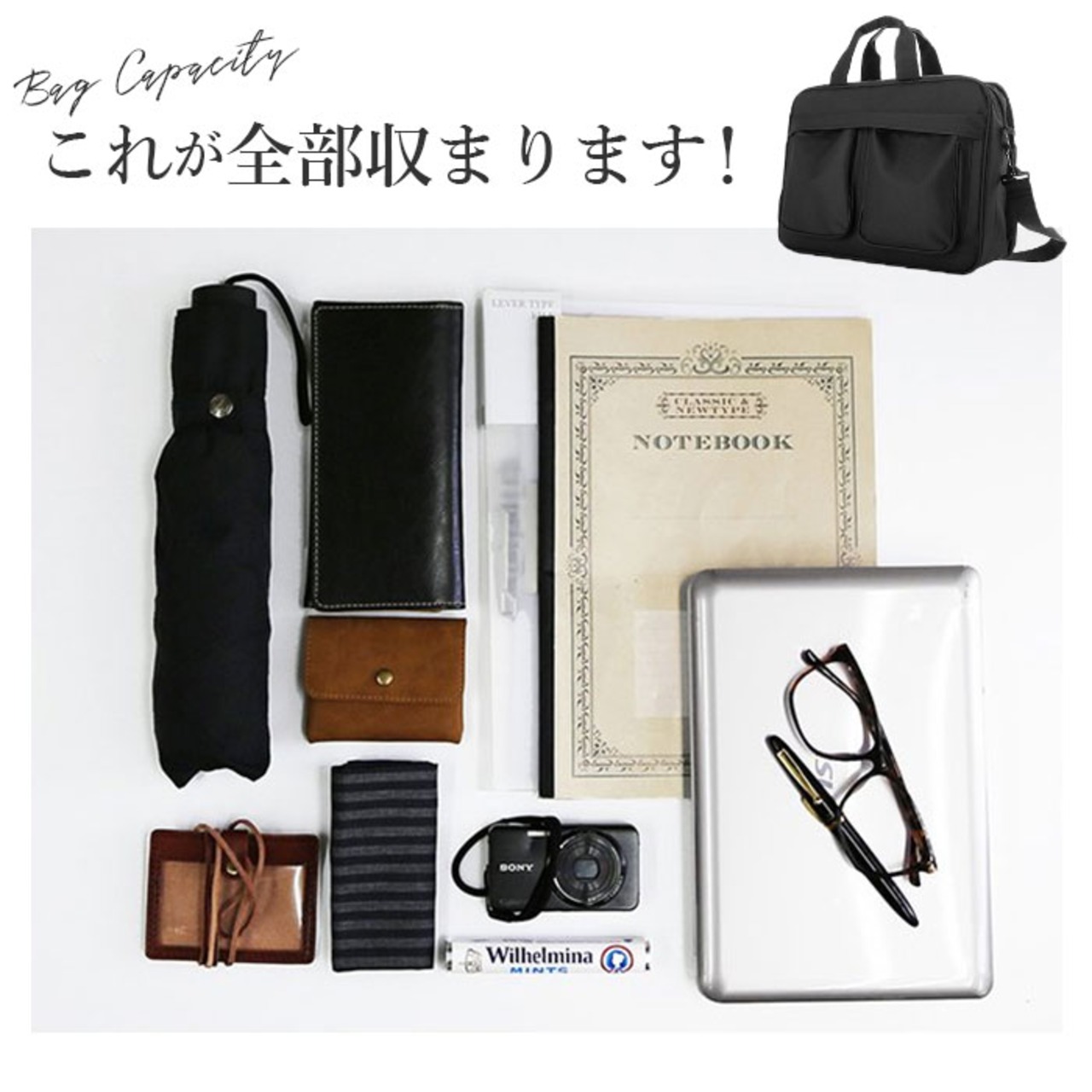 ・フロントに配置された2つのカブセポケットが印象的な、スタンダードタイプのビジネスバッグ。