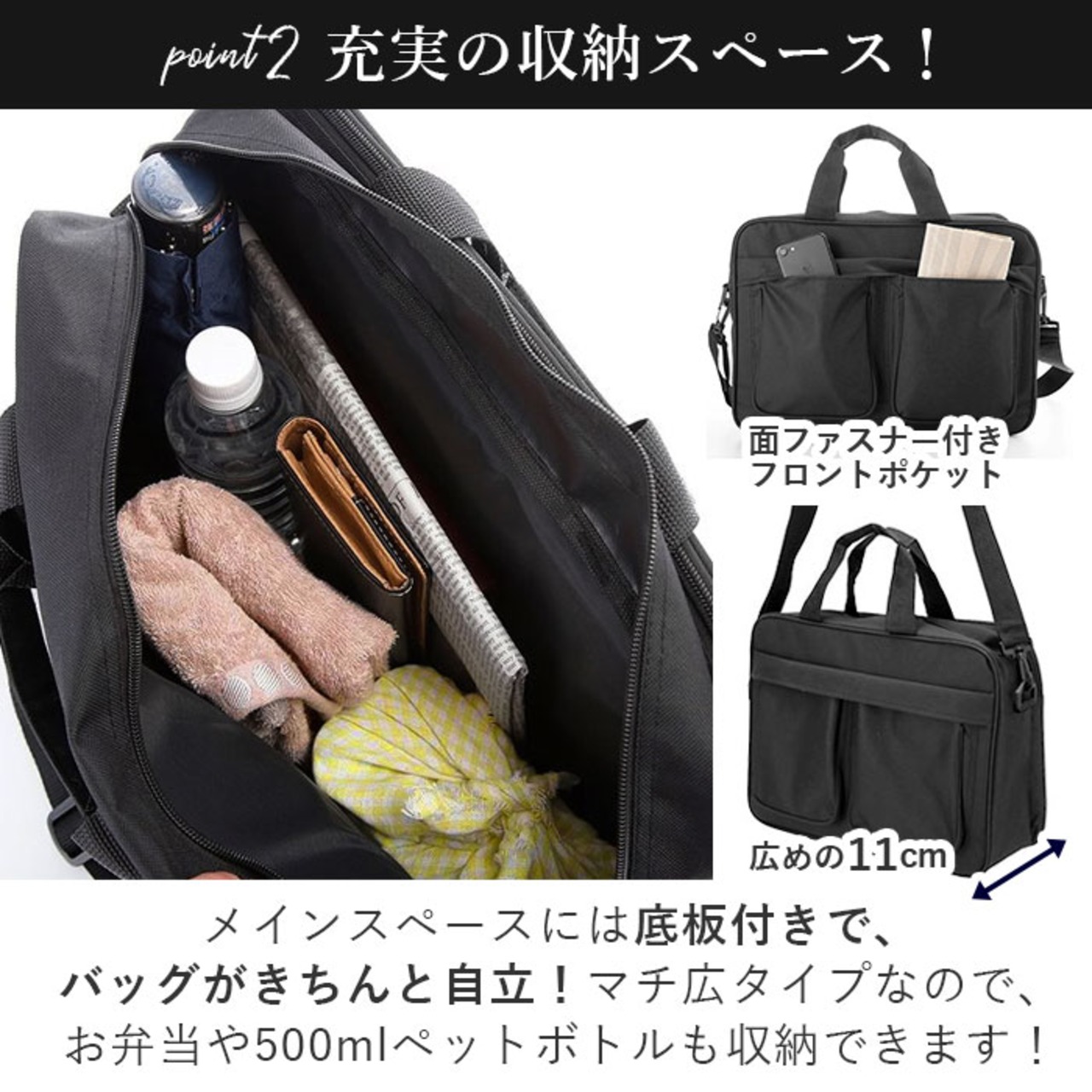・メインスペースには底板付きで、書類や書籍など重みのある物も収納出来て、バッグがきちんと自立。マチ広タイプなので、ランチボックスや500mlペットボトルもしっかり収納できる。