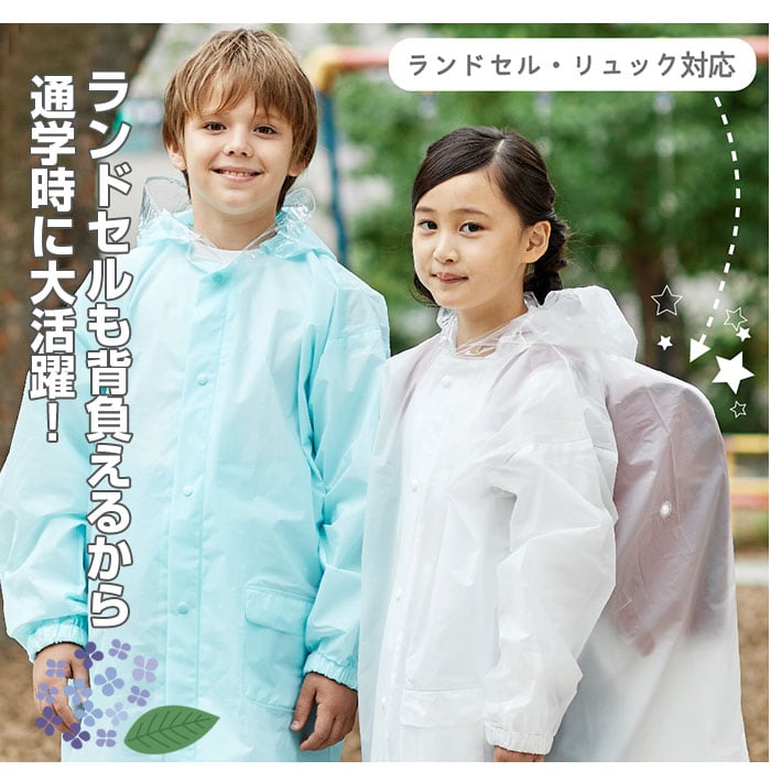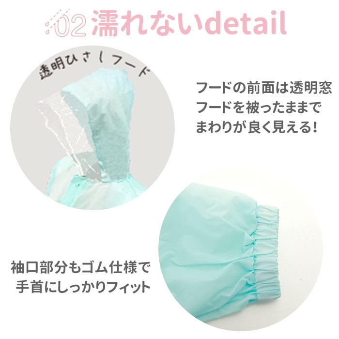 ・すっぽりと被れるフードのひさし部分は透明素材!傘を差しながら通学する時も前が見やすく安心!