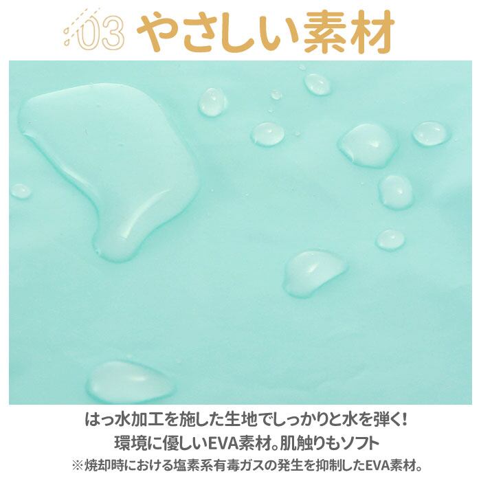 ・はっ水加工を施した生地で、しっかりと水を弾く!環境に優しいEVA素材(※)で、肌触りもソフト。(※焼却時における塩素系有毒ガスの発生を抑制したEVA素材。)