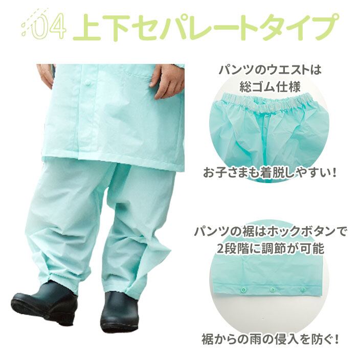 ・前開き部分は開け閉めしやすい2重のホックボタン式。袖口部分もゴム仕様で、手首にしっかりフィット!雨の侵入をしっかりと防ぐ。