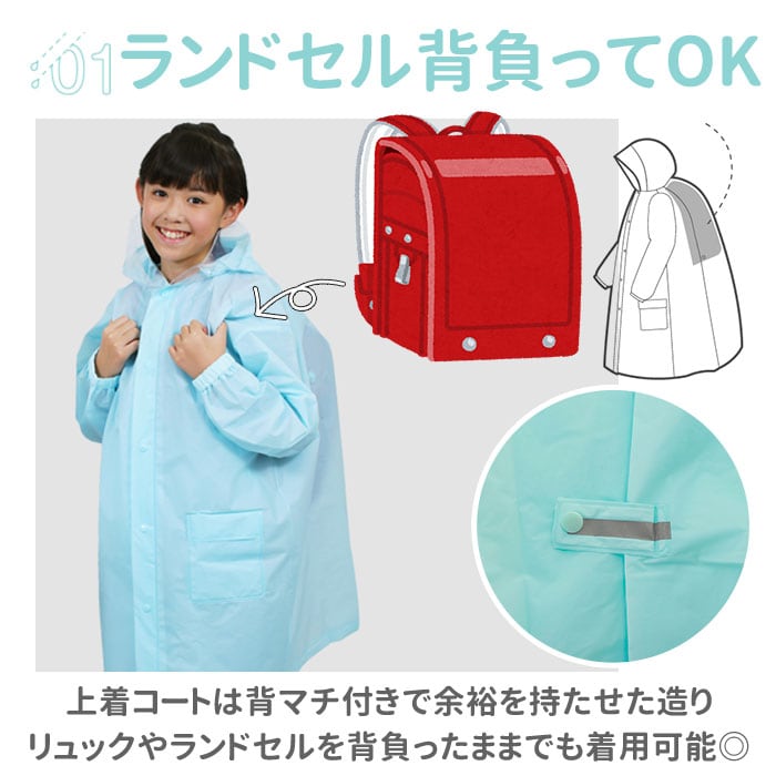 ・コートの背面、背マチ調整ベルト部分にリフレクター素材付き。薄暗い雨の日や夜間でも、背後からすれ違う車から認識されやすくなり、ママパパも安心。