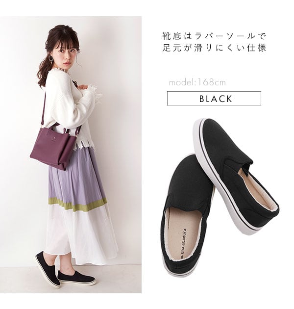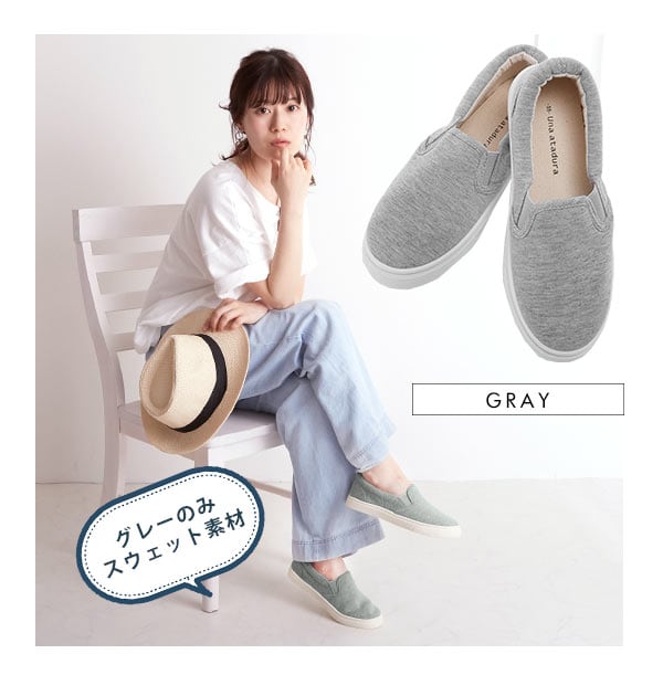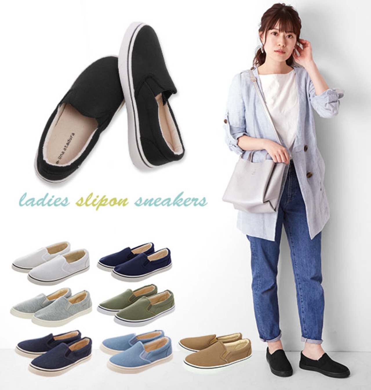 少しリラックスしてお出かけしたいときにぴったり!Una atadulaのシンプルで履きやすいスリッポン。靴紐がなく、さっと足を入れることができるので、脱ぎ履きが楽ちんです。かかとのフチ部分にはクッション性があり、疲れにくい!ラフな素材感が可愛い、飽きを感じさせないデザインです。