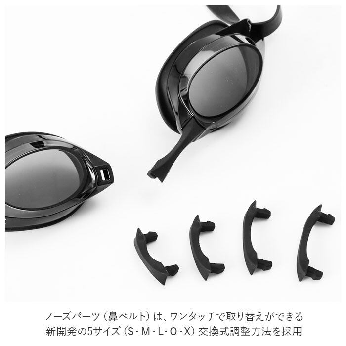 ・ノーズパーツ(鼻ベルト)は、ワンタッチで取り替えができる、新開発の5サイズ(S・M・L・O・X)交換式調整方法を採用。