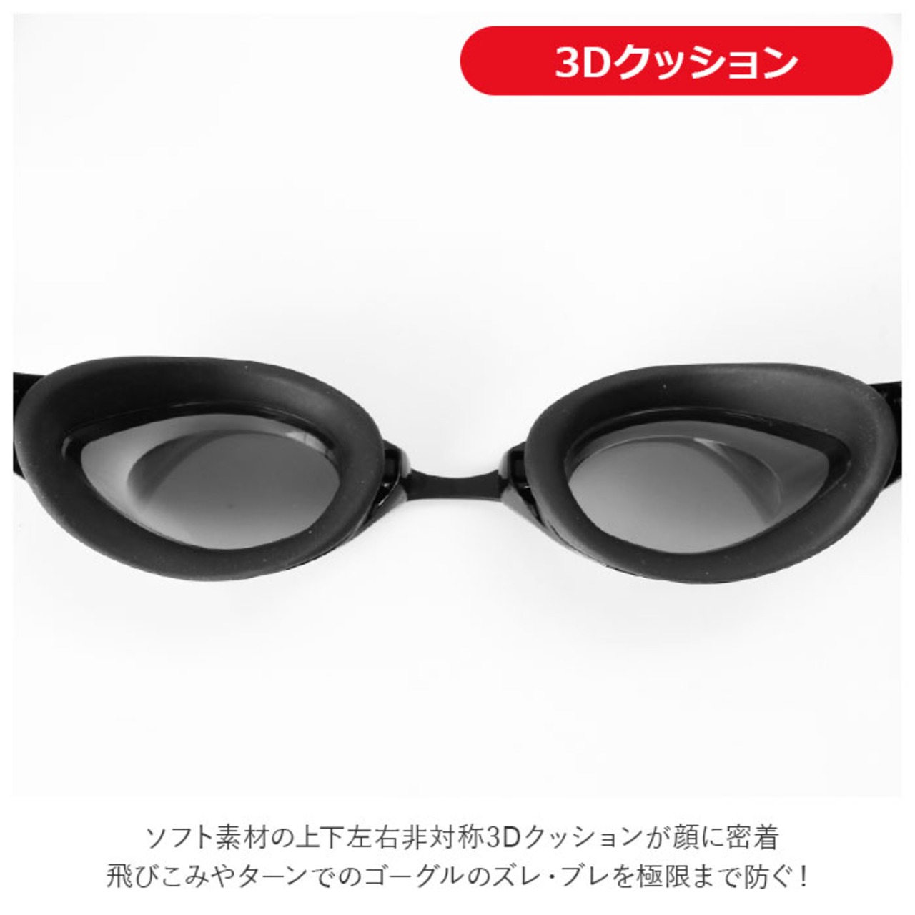 ・顔に沿うように設計されたソフト素材の上下左右非対称3Dクッションが顔に密着。飛びこみやターンでのゴーグルのズレ・ブレを極限まで防ぐ!