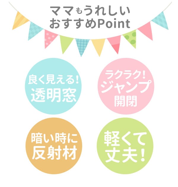 また、傘のまわりは反射材がついているので、夜道でヘッドライトの光を反射し、安心です。