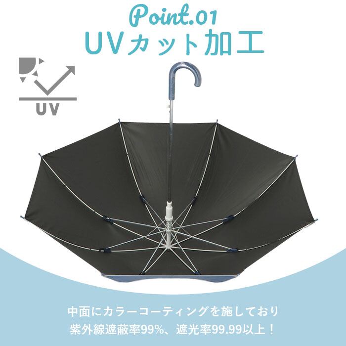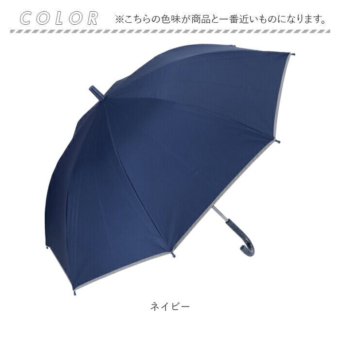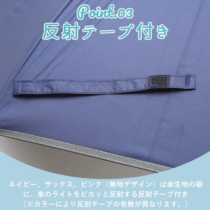 ・ネイビー、サックス、ピンク(無地デザイン)は傘生地の裾に、車のライトをピカッと反射する反射テープ付き。薄暗い雨の日や夕方の下校時間でも安心。(※カラーにより反射テープの有無が異なります。)