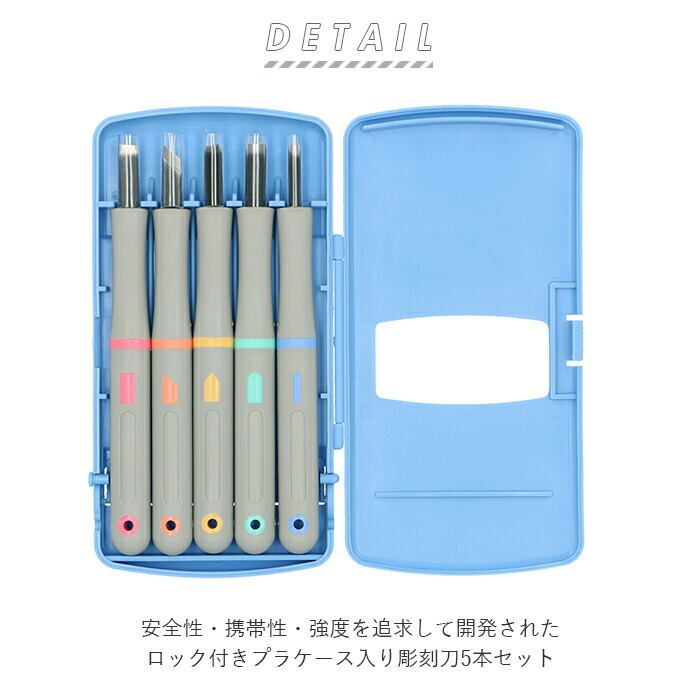 ・安全性・携帯性・強度を追求して開発された、ロック付きプラケース入り彫刻刀5本セット。