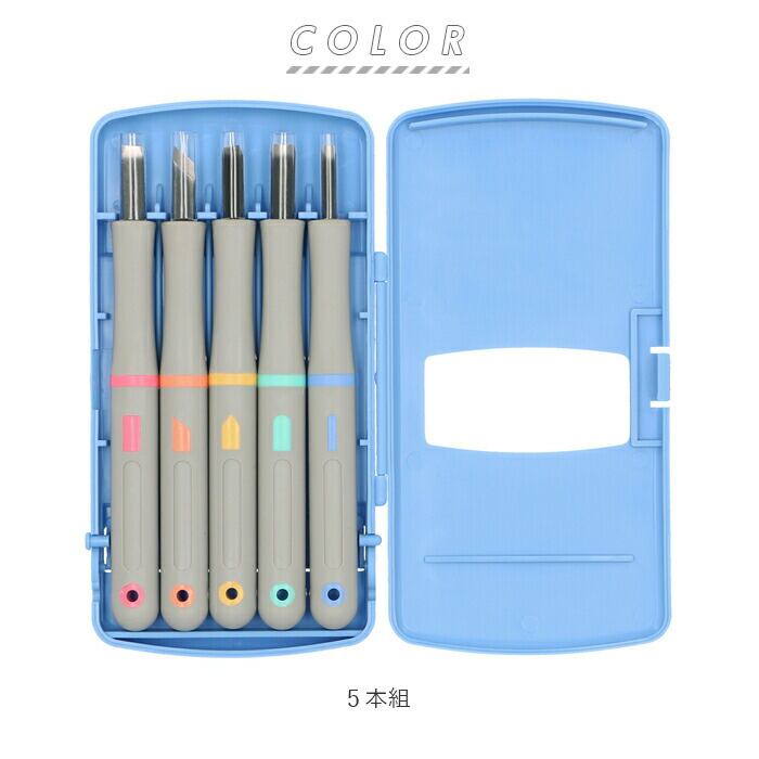 ・平刀、切り出し刀、三角刀、中丸刀、小丸刀の全5種類。刃の形状アイコンと色分けされたハンドルで、お目当ての彫刻刀がひと目でわかる♪
