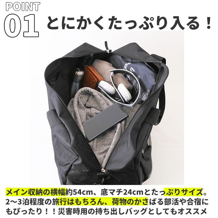 ・メイン収納の横幅約54cmとたっぷりサイズ。お子様の修学旅行用バッグとしてはもちろん、部活やスポーツイベント用のバッグとしても活躍する大容量43リットル!