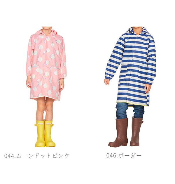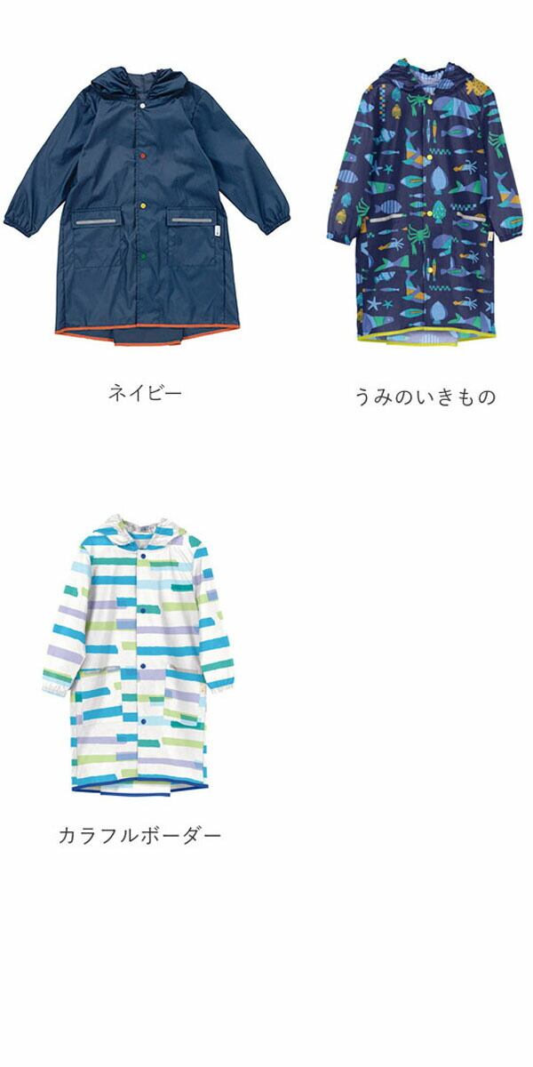 キッズが一人でも脱ぎ着しやすいスナップ式の前ボタンタイプで、フード部分に紐を使用していないので、首に巻きつく心配がありません。さらに、左右のポケット・背面ベルト・背面裾の4か所にリフレクター(反射材)が付いて、雨や曇りなどのお天気でも視認性が高く、お子様の安全に配慮されています。背面のスナップボタンを外すことでランドセルやリュックを背負ったままでも着用できるため、雨の日の通学用にぴったり。可愛らしいテキスタイルを使用したデザインをカラーバリエーション豊富にご用意しています。