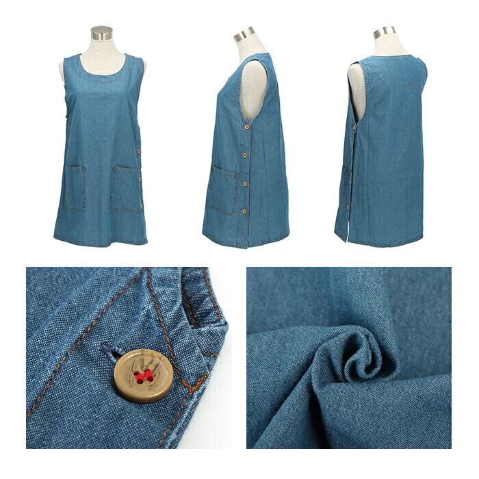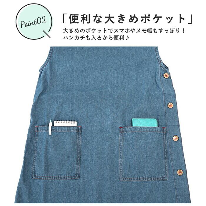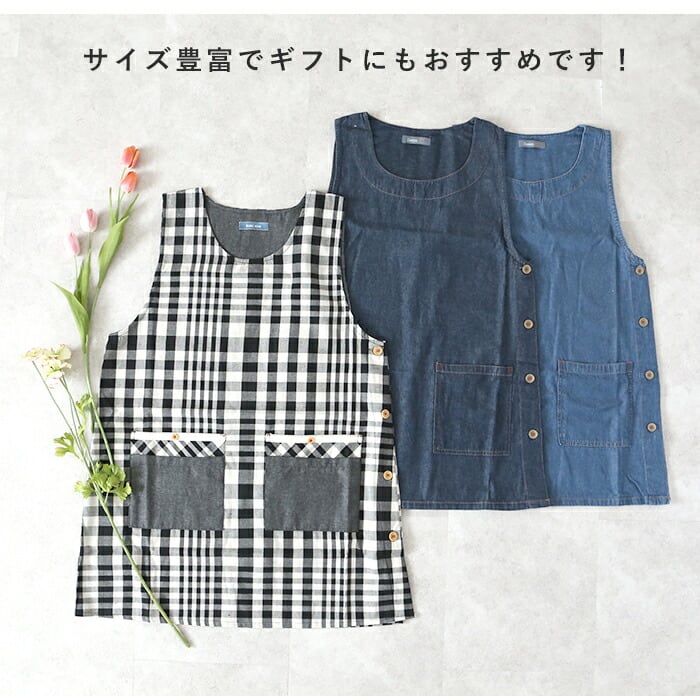 ・デニム素材のエプロンはカジュアルに使用できるので、家事以外の庭掃除や制作にも使えて、男女年代問わず使用ができる。