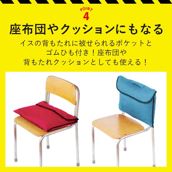 ・防災ずきんをカバーの中に収納した状態で椅子の座面に置けば、ふんわり柔らかい座布団に変身!学校のロッカーでも場所を取らず、収納場所にも困らなくて便利!