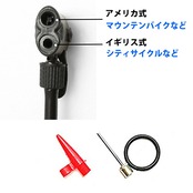・自転車のタイヤに空気を送るノズルのバルブコネクタ部分は、「アメリカ式(米式)」・「イギリス式(英式)」の2タイプに対応したツインバルブ方式。(※上部の穴がマウンテンバイクなどに多く使用される「アメリカ式(米式)」、下の穴がシティサイクルに多く使用される「イギリス式(英式)」。)
