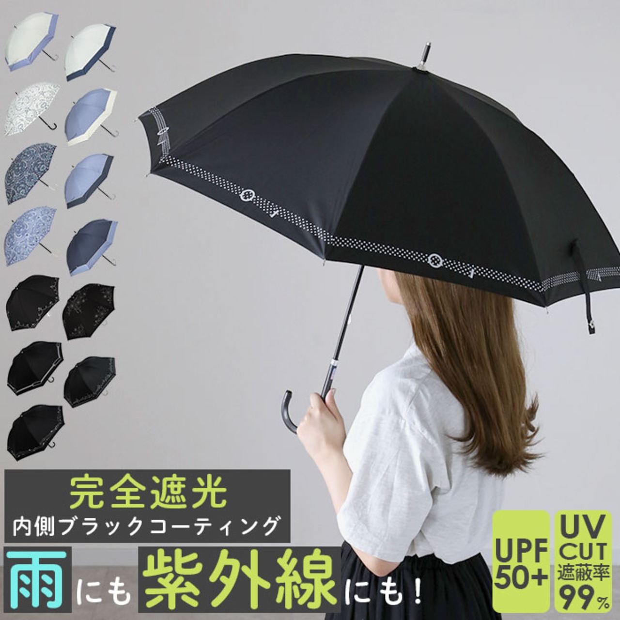 ・傘生地の内側にはブラックコーティング加工を施し、UPF50+、UV99%以上カットの完全遮光タイプ!