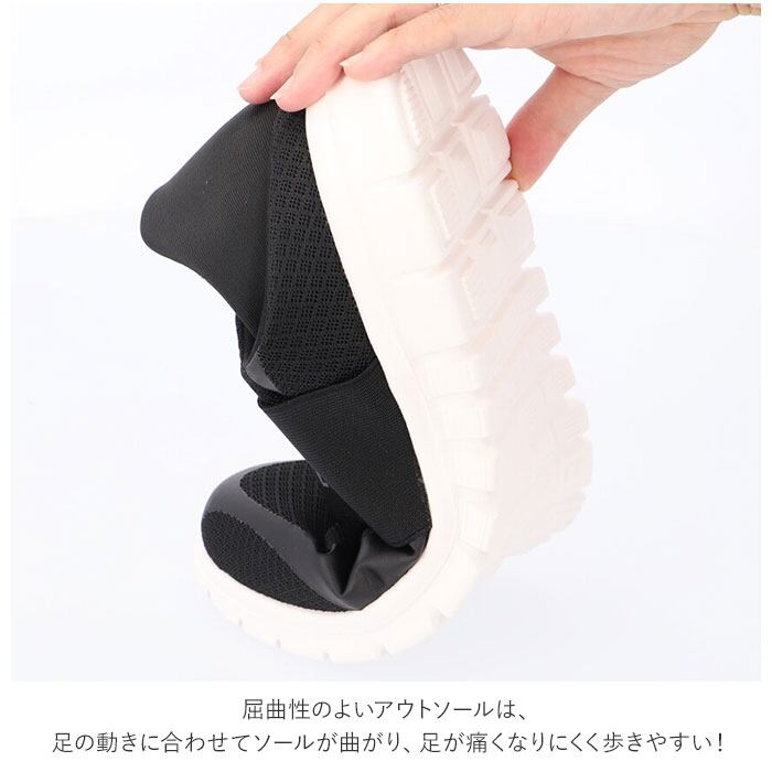・屈曲性のよいアウトソールは、足の動きに合わせてソールが曲がり、足が痛くなりにくく歩きやすい!