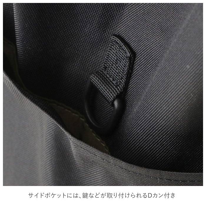 ・PC用収納ポケットには、PCだけでなくお気に入りの書籍や書類などを入れても。サイドポケットには、鍵などが取り付けられるDカン付き!