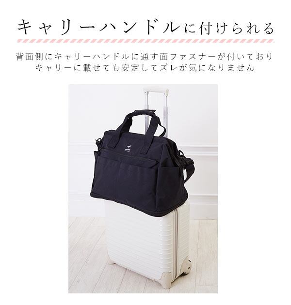 アネロのリップストップ杢調ポリエステルの中型ボストンバッグです。メインのポケットにメッシュのファスナーポケットがあり、衣類やコスメなどわかりやすく収納できます。背面にはキャリーバッグの持ち手に固定できるマジックテープ付きベルトが付いています。ショルダーベルトは着脱可能。オープンポケットなど収納も豊富です。