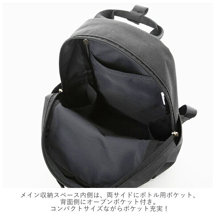 ・メイン収納スペース内側、両サイドにボトル用ポケット、背面側にオープンポケット付き。コンパクトサイズながらポケット充実!