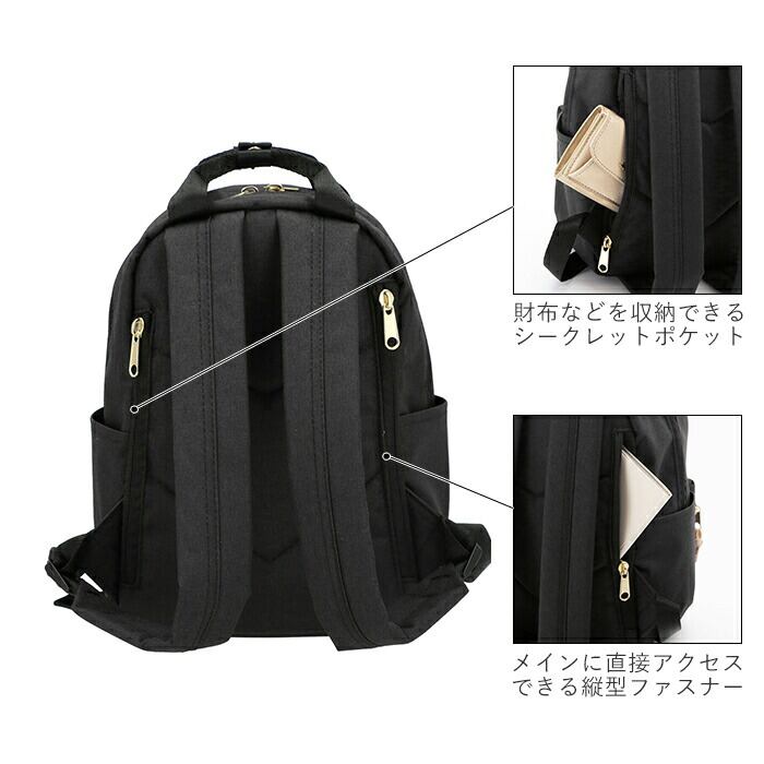 ・リュック背面右側にメイン収納に直接アクセスできる縦型ファスナー。さらに右側にはシークレットポケット付きで2つ折り財布などの貴重品も安心して収納できる。