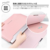 ・背面にはパソコン作業のしやすい角度に調節できる、スタンド機能付き。猫背改善や手首の負担軽減になり、ノートPC本体に熱がこもらず放熱性に優れた設計。