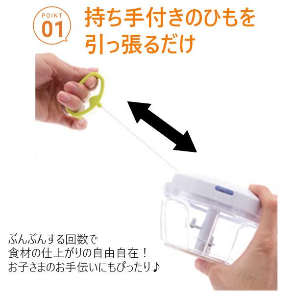 あっという間にみじん切りができる調理器具♪引っ張るだけの手軽な手動式!硬い野菜・涙がとまらない玉ねぎ・手につく匂いが気になるにんにくなどのみじん切りに!刻みだけでなく混ぜることも可能で、タルタルソースや離乳食も簡単につくれます。引っぱるだけなので、お子様も楽しくお手伝い♪