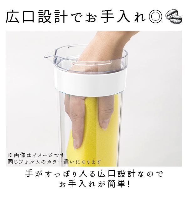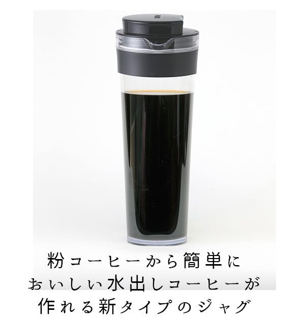 水出し専用コーヒージャグ。水を注ぎ、フィルターポットに豆を入れて約8時間で、自宅で水出しコーヒーが作れます。フィルターがついているので簡単。密閉保存でコーヒーの風味を逃がしにくい構造です。自宅で簡単に水出しコーヒーが楽しめます。