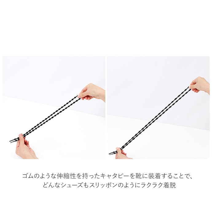 ・ゴムのような伸縮性を持ったキャタピーを靴に装着することで、どんなシューズもスリッポンのようにラクラク着脱。
