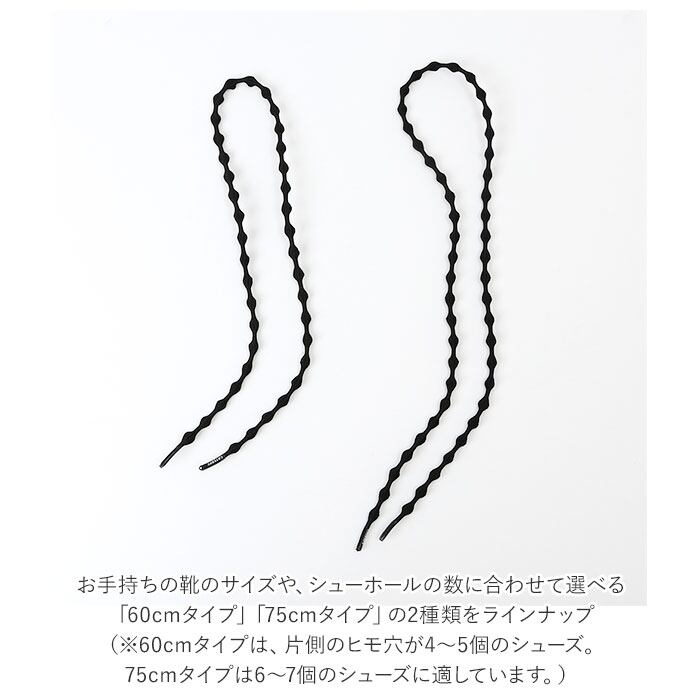 ・お手持ちの靴のサイズや、シューホールの数に合わせて選べる「60cmタイプ」「75cmタイプ」の2種類をラインナップ。(※60cmタイプは、片側のヒモ穴が4〜5個のシューズ。75cmタイプは6〜7個のシューズに適しています。)
