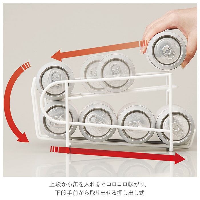 ・上段から缶を入れるとコロコロ転がり、下段手前から取り出せる押し出し式。