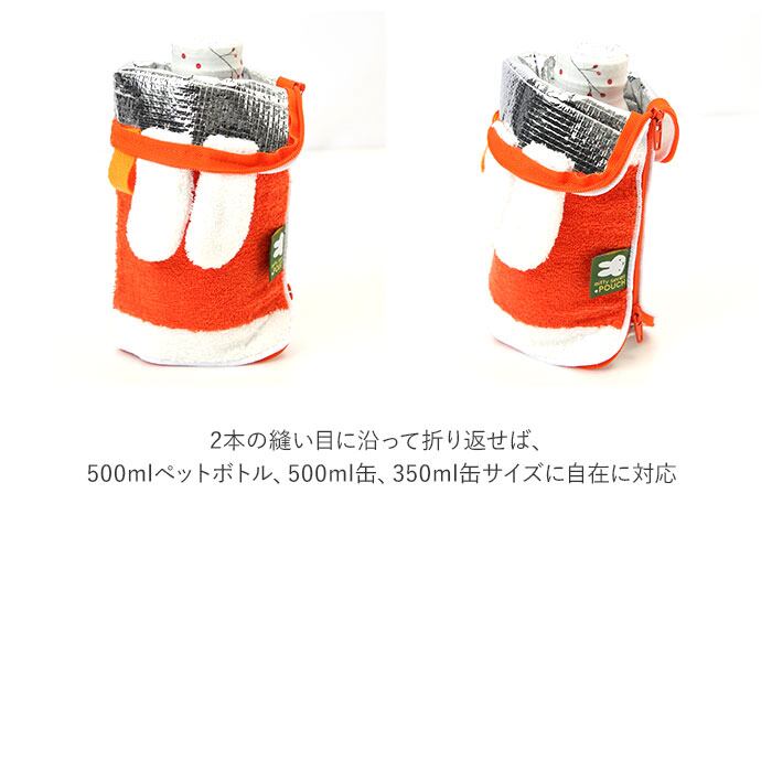 2本の縫い目に沿って折り返せば、500mlペットボトル、500ml缶、350ml缶サイズに自在に対応。