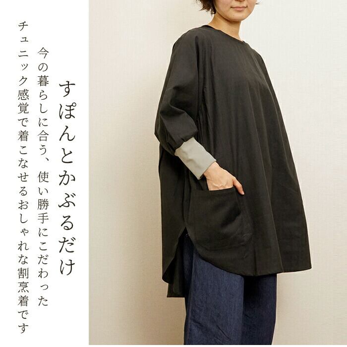 割烹着 おしゃれ 通販 無地 かっぽう着 エプロン チェニック ゆったり 大きめ 汚れ ガード 袖口 リブ 綿100% 動きやすい 大きい ポケット 裾 ラウンド 機能的 無地 カジュアル ユニセックス レッド ベージュ ブラック か