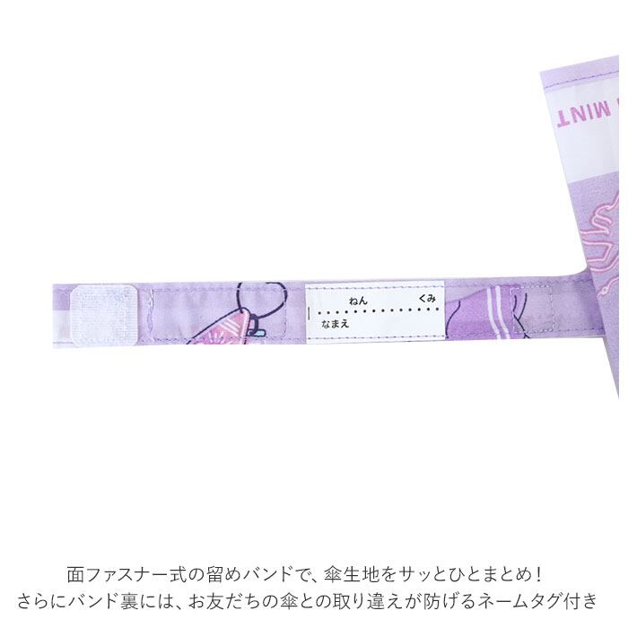 ・面ファスナー式の留めバンドで、傘生地をサッとひとまとめ!角丸加工を施しており、お子さまの指先をキズから守ってくれる。
