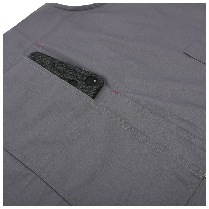 ・左の胸元にペン挿しポケットが2つ、フロントにスマホが横向きにすっぽり収まる幅広ポケットが4つ付いていて、機能性も抜群!