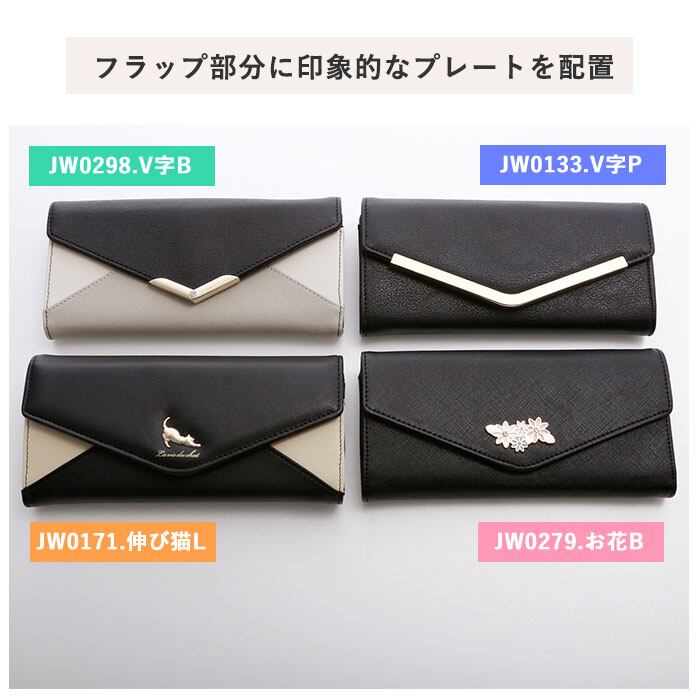 ・V字プレートにビジューがついたタイプ(JW0298.V字B)には、ファスナー式小銭入れ×1、お札入れ×2、オープンポケット×2、カードポケット×10。