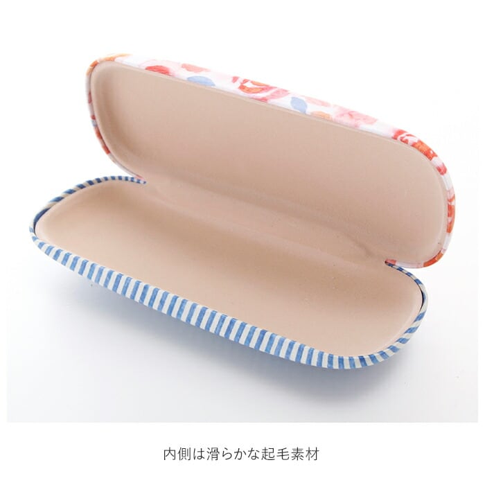 ・丈夫で凹みにくいハードタイプのケースで、表面は柄が引き立つ肌触りのよい布地貼り。内側も滑らかな起毛素材で、大切なメガネを優しく保管できる。