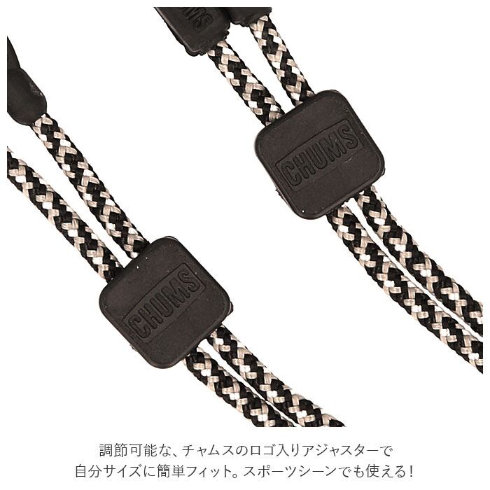 ・調節可能な、チャムスのロゴ入りアジャスターで自分サイズに簡単フィット。スポーツシーンでも使える!