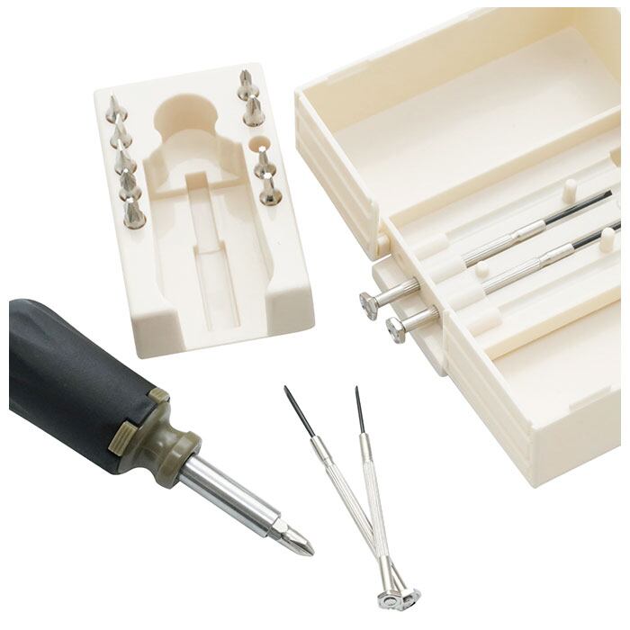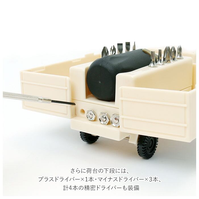 ・さらに荷台の下段には、プラスドライバー×1本・マイナスドライバー×3本、計4本の精密ドライバーも装備。