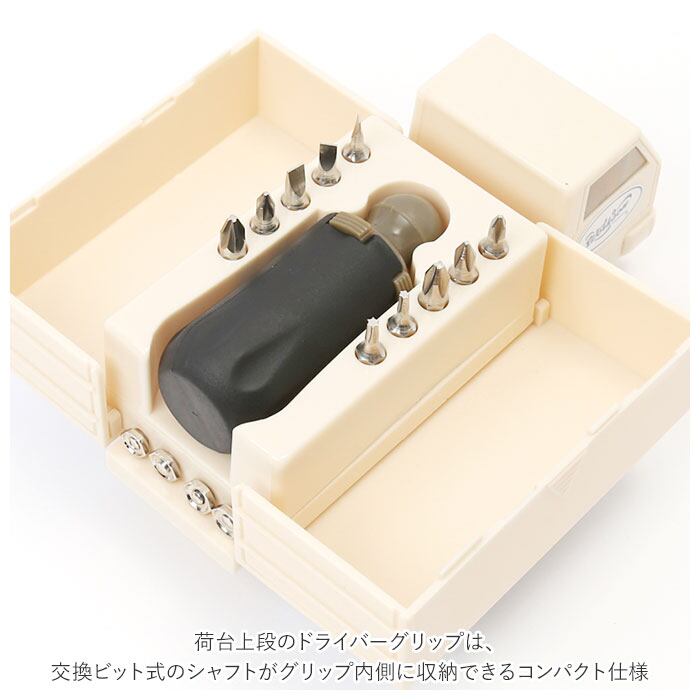 ・荷台上段のドライバーグリップは、交換ビット式のシャフトがグリップ内側に収納できるコンパクト仕様。