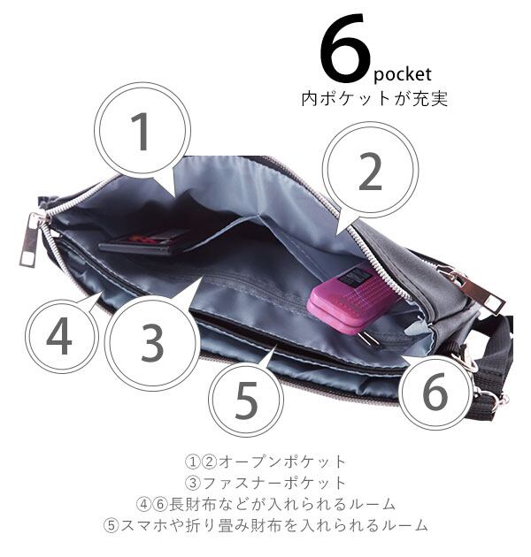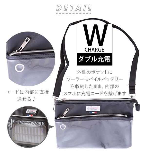 シンプルなサコッシュタイプのショルダーバッグです。フロントのファスナーポケットがPVC樹脂製のクリアータイプになっているのがポイント!ソーラーモバイルバッテリーを収納するのにちょうどよく、歩きながら太陽の光で充電が可能です。さらに、内部に充電コードを通せるリングホールも付いているので、メイン収納部分にしまったスマートフォンとも接続できます。