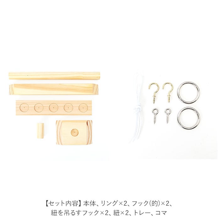 ・【セット内容】本体、リング×2、フック(的)×2、紐を吊るすフック×2、紐×2、トレー、コマ