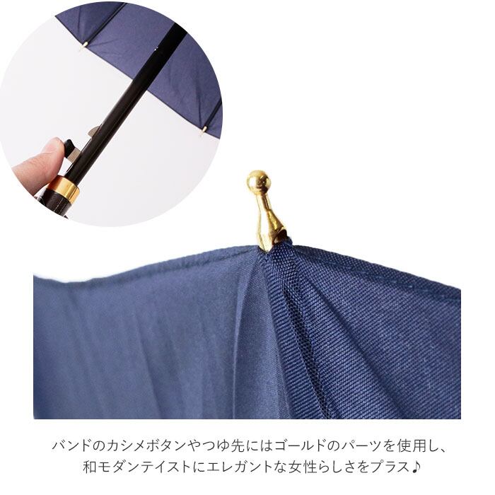 ・傘生地をまとめるバンドのカシメボタンやつゆ先にはゴールドのパーツを使用し、和モダンテイストにエレガントな女性らしさをプラス!