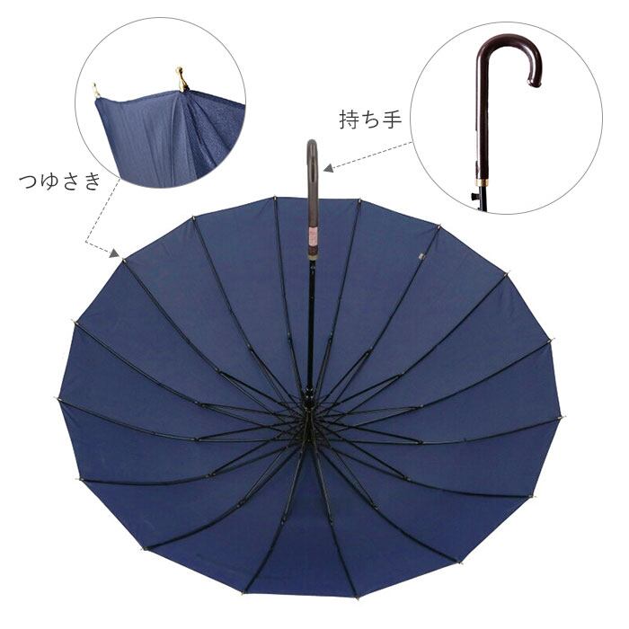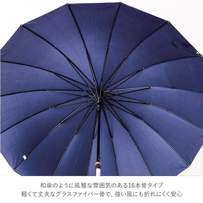 ・傘骨は、和傘のように風雅な雰囲気のある16本骨タイプ。軽くて丈夫なグラスファイバー骨で、強い風にも折れにくく安心。