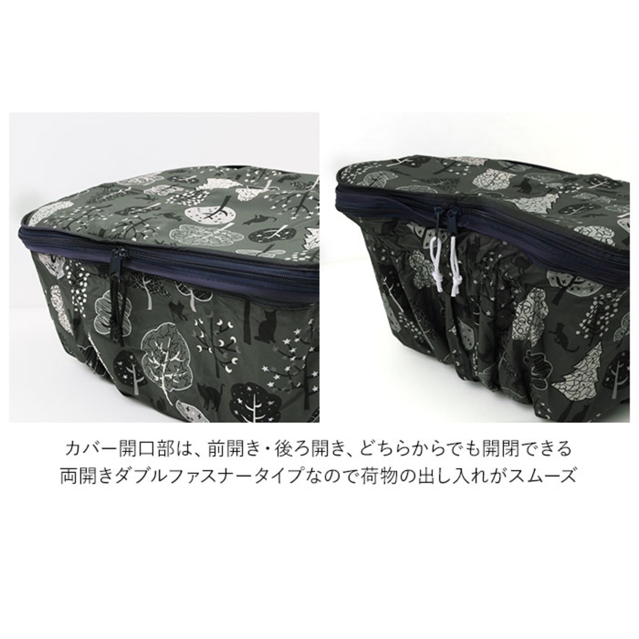 ・カバー開口部は、前開き・後ろ開き、どちらからでも開閉できる両開きダブルファスナータイプなので荷物の出し入れがスムーズ。