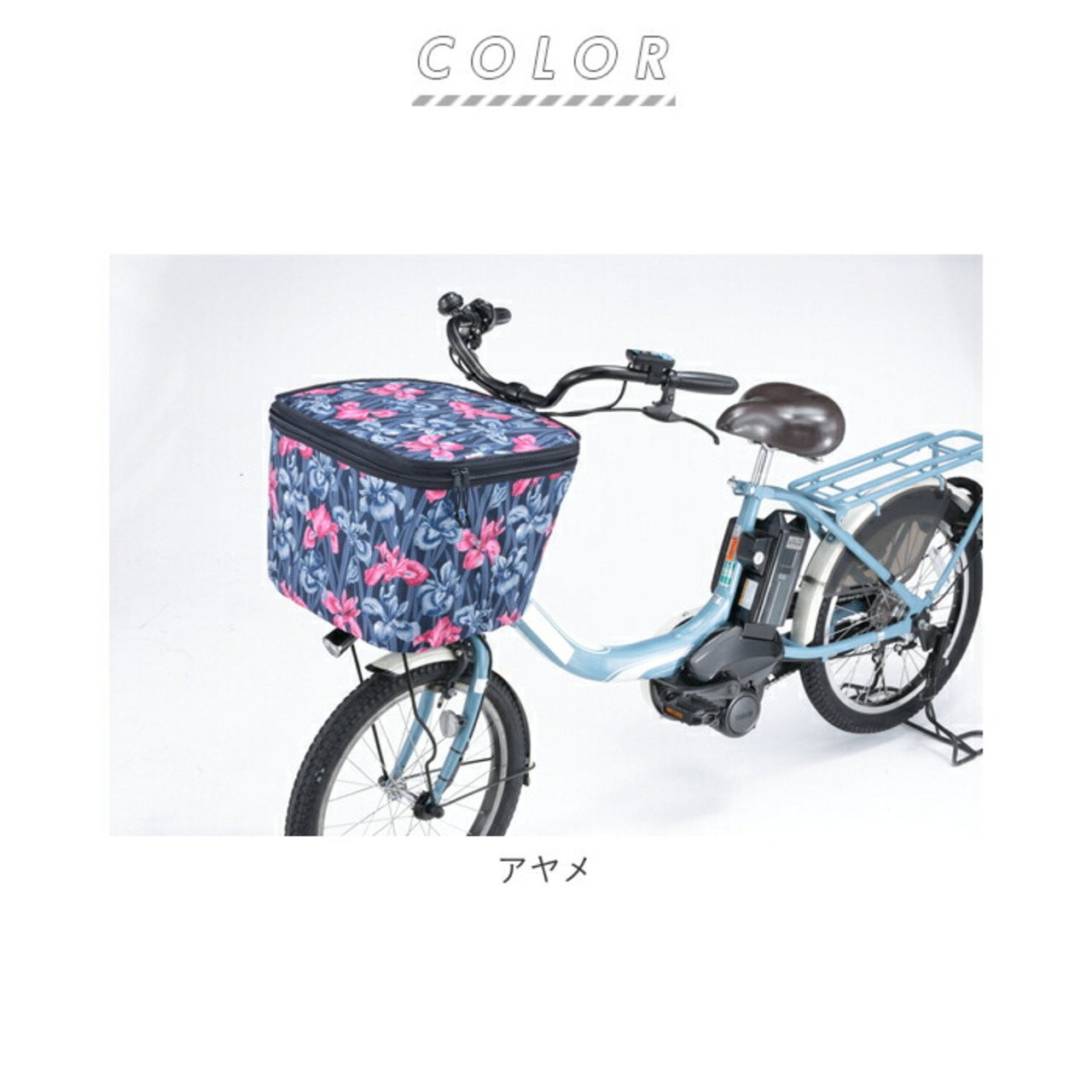 ・背面ゴム&ヒモ留め式で、前カゴにしっかりと装着可能。